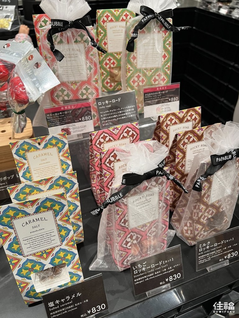 而上圖下方的這三款,從左至右分別是焦糖鹽糖果、草莓口味的 Rocky road(一種巧克力與棉花糖混合而成的糖果)、牛奶口味的 Rocky road,都是相當人氣的糖果。