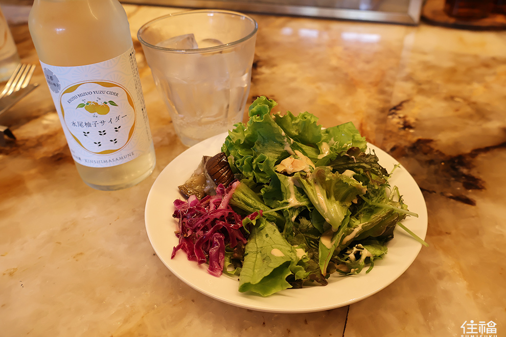 披薩上桌之前,會先提供生菜沙拉做為開胃,當天我還幫自己點了一個京都生成的柚子蘇打~生菜沙拉的醬是油醋,酸酸甜甜配上超新鮮的野菜,平時相當討厭吃生菜的我,也忍不住把整盤都吃完!