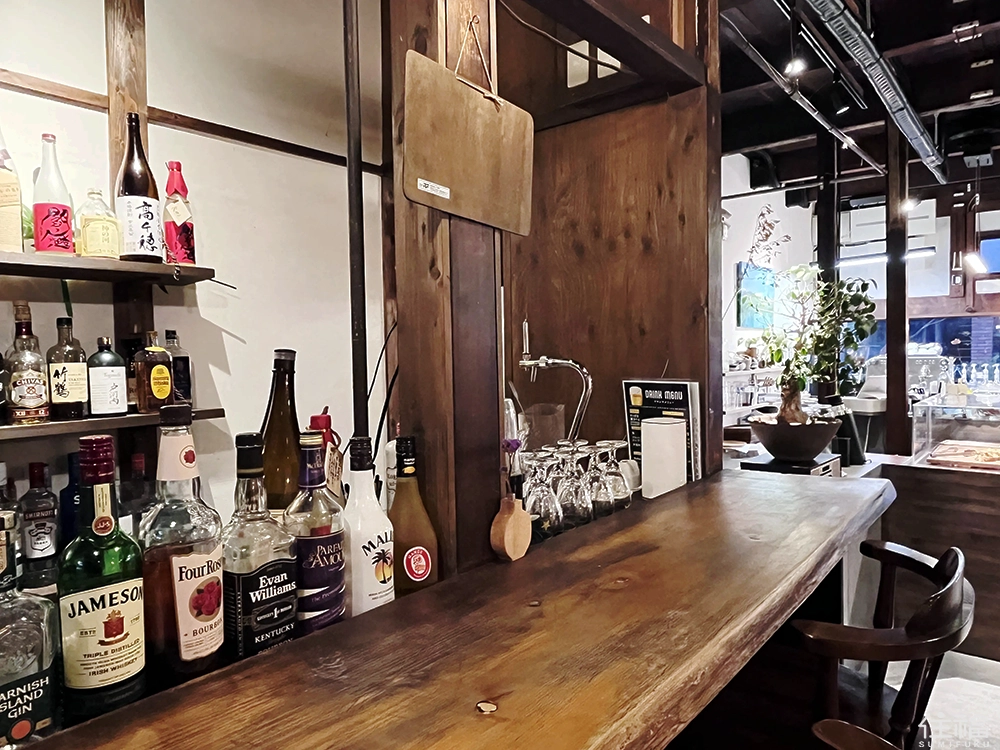 當時我選的座位區域,是吧台區,眼前擺放了各式各樣的調酒器材與酒瓶,這與一般咖啡廳的景象不太相同,我好奇地查了一下,才發現這個空間,晚上 18:00 之後,會搖身一變為夜間咖啡酒吧,也難怪店名會特別強調「Cafe & Bar」,而不只是咖啡廳而已。