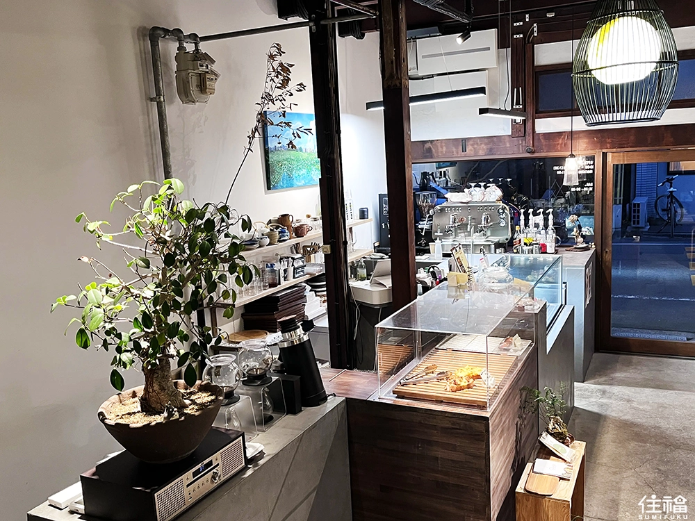 最初從門口走進來,左手邊是兩張小桌席座位,這一區不需要脫鞋;再往後則是鋪設榻榻米的拖鞋座席空間;而榻榻米的另一旁,也就是靠近酒吧的地方——吧台區,呈現了三種不同型態的座位設計,這點我覺得很有趣。整體空間延續老屋原有結構,從牆面、木門到細節處,都保留了復古溫潤的質感,我坐在吧台區,朝著窗邊向外望去,能看到工作人員在對面的空間,很認真地在製作蛋糕,為這間咖啡廳增添了不少生活感。