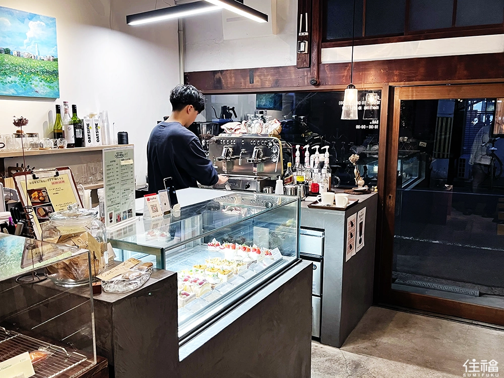 白天時段,空間裡有著略顯冷靜的咖啡師負責接待;後方則是有著製作蛋糕的韓國女生;而在接近傍晚時,又看到一位看起來同樣酷酷的男生,走進後方的蛋糕製作空間,彷彿正準備接手晚上工作。那瞬間,我不禁猜想,這或許是一個由三位來自不同領域的人,一起共同經營,且各自負責不同時段的角色,可以說是將老屋空間活用至最大。