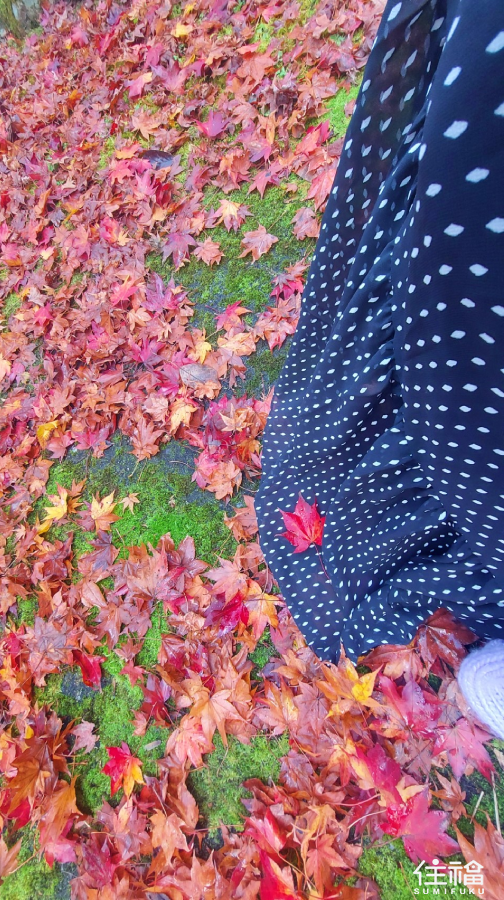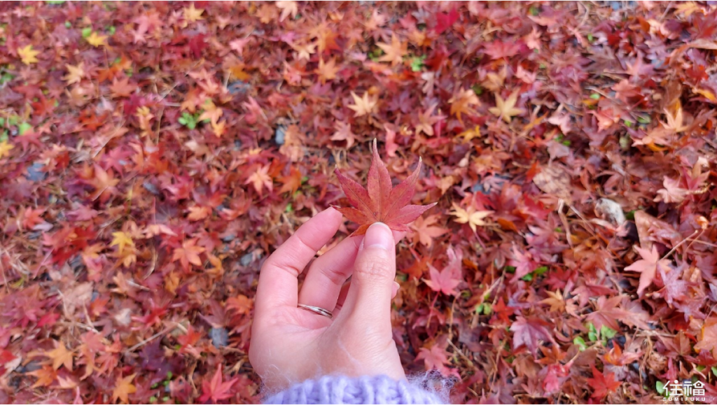 滿地楓紅中,碧綠的青苔若隱若現,隨意拍個近景,便是最詩意的秋天了。