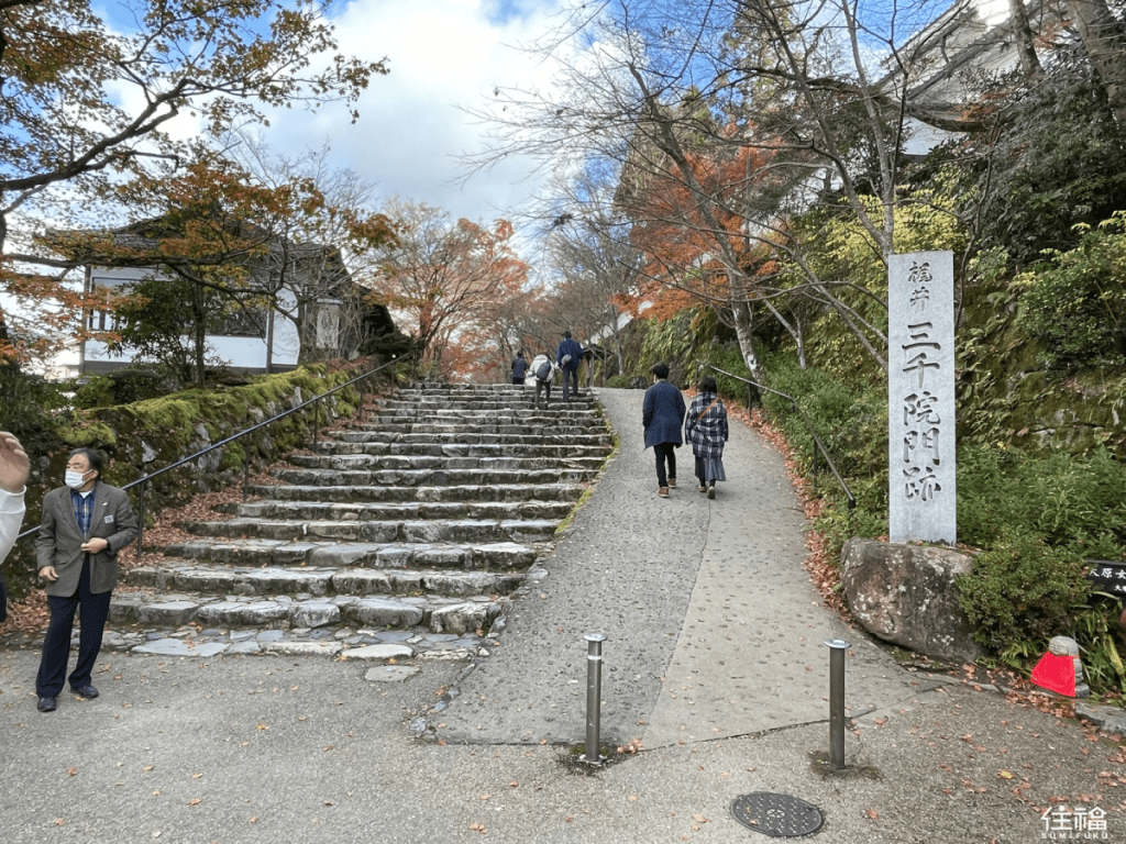 三千院門跡旁的階梯拾級而上,才是大原三千院的正門入口,進入之後有指示牌,將團體客人與自由行的散客進行分流,進入三千院參觀需要門票,價格匯整於文章最末尾。