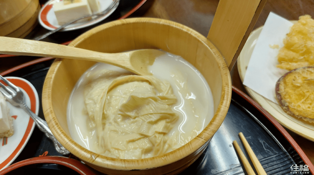 跟我一樣喜歡豆腐的旅人一定要吃吃看,它被泡在豆漿裡,散發著非常清新的豆香味,口感滑順,真是極品!除了豆皮外,請務必跟著豆漿一起吃,簡單樸素卻十分美味。
