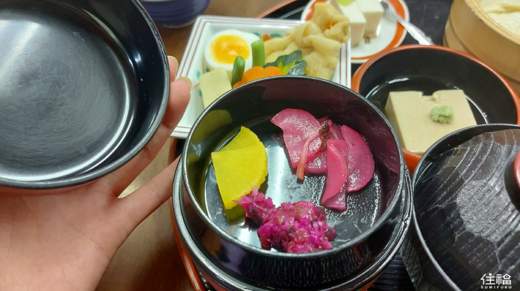 此外,由於這個套餐的料理調味都十分清淡,所以還附了這邊的特產,三種醃菜,搭配著白飯一起吃不至於單調。