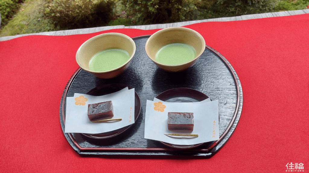 那裡設有紅色的茶席,每席600日元,有一杯抹茶與一份小點心,只有購買茶點的旅人才能夠坐在茶席上輕鬆又近距離的欣賞庭院唷。