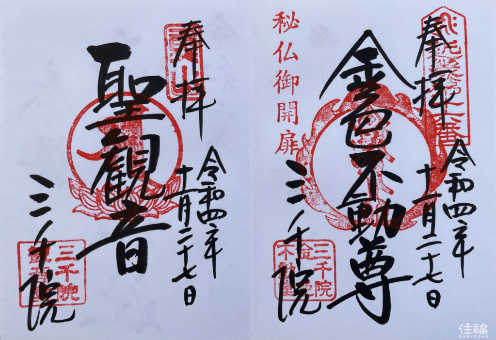 在客殿蓋了第一個御朱印後,穿過有清園往上爬會來到第二個御朱印所,那便是金色不動堂,在那裡可以同時購入金色不動尊與聖觀音的御朱印,其實觀音堂位於金色不動堂的再往上一點,想來是觀音堂較小,故將御朱印於金色不動堂一起販售。