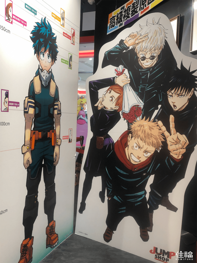 JUMP SHOP涉谷店讓海賊王裡的魯夫和七龍珠裡的悟空站在門口處迎賓,這家店內有著玲瑯滿目日本當紅的漫畫周邊,包含「咒術迴戰」、「鬼滅之刃」、「我的英雄學院」等等,你想得到的、想不到的商品通通應有盡有。