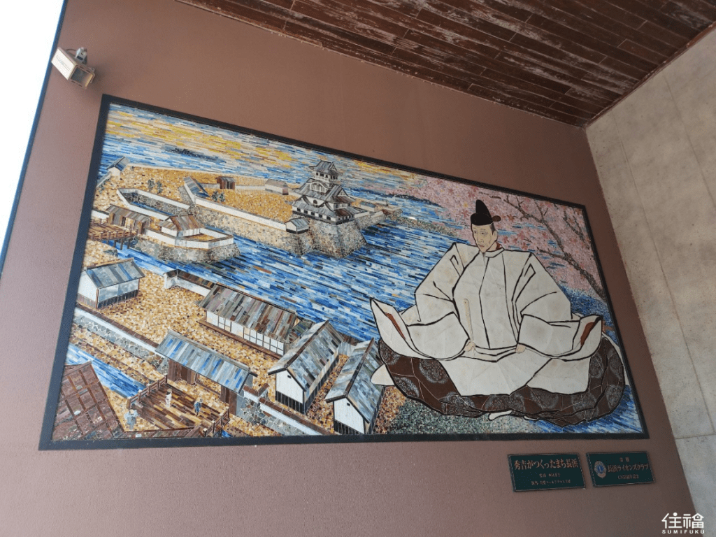 這幅玻璃畫主題是豐臣秀吉與他所建造的城鎮。