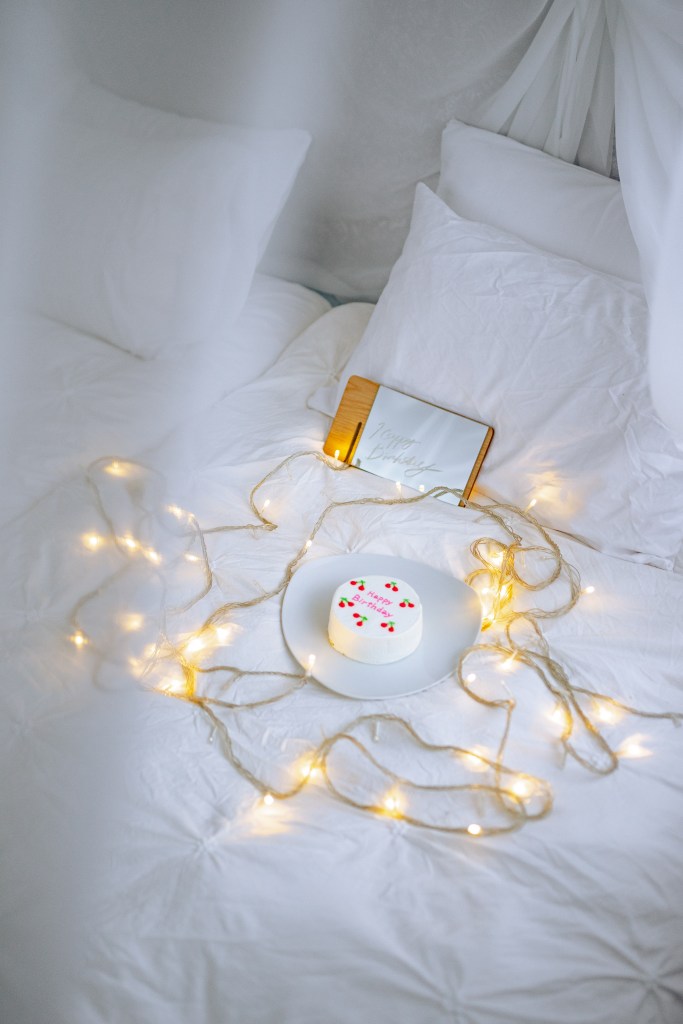 推し色のスイーツを買って、天蓋つきのベッドがある真っ白なお部屋で撮影。プロジェクターもあるのでそのままDVD鑑賞もできるまさに「押しのための1日」を実現できる宿です。
