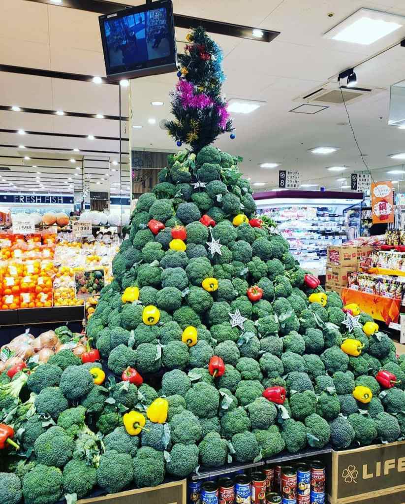 跟大家分享一下有趣的事情,日本網友在日本超市Life捕捉到的野生「花椰菜聖誕樹」,超級有創意,聖誕樹的部分,是由一顆顆綠油油的花椰菜堆積組成的,沒有用聖誕球裝飾,他這邊選用的是超市新鮮的紅椒跟黃椒,一方面可以節省掉買聖誕樹的經費,另一方面呢,是成功的吸引顧客來買超市的花椰菜和甜椒們。