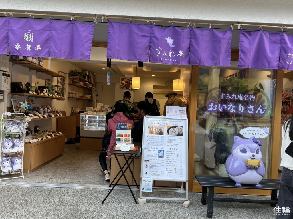 高尾すみれ庵以堇花的紫色為裝潢的主色,看起來相當浪漫可愛,門口還有圓滾滾的可愛迎賓吉祥物「モモちゃん」。