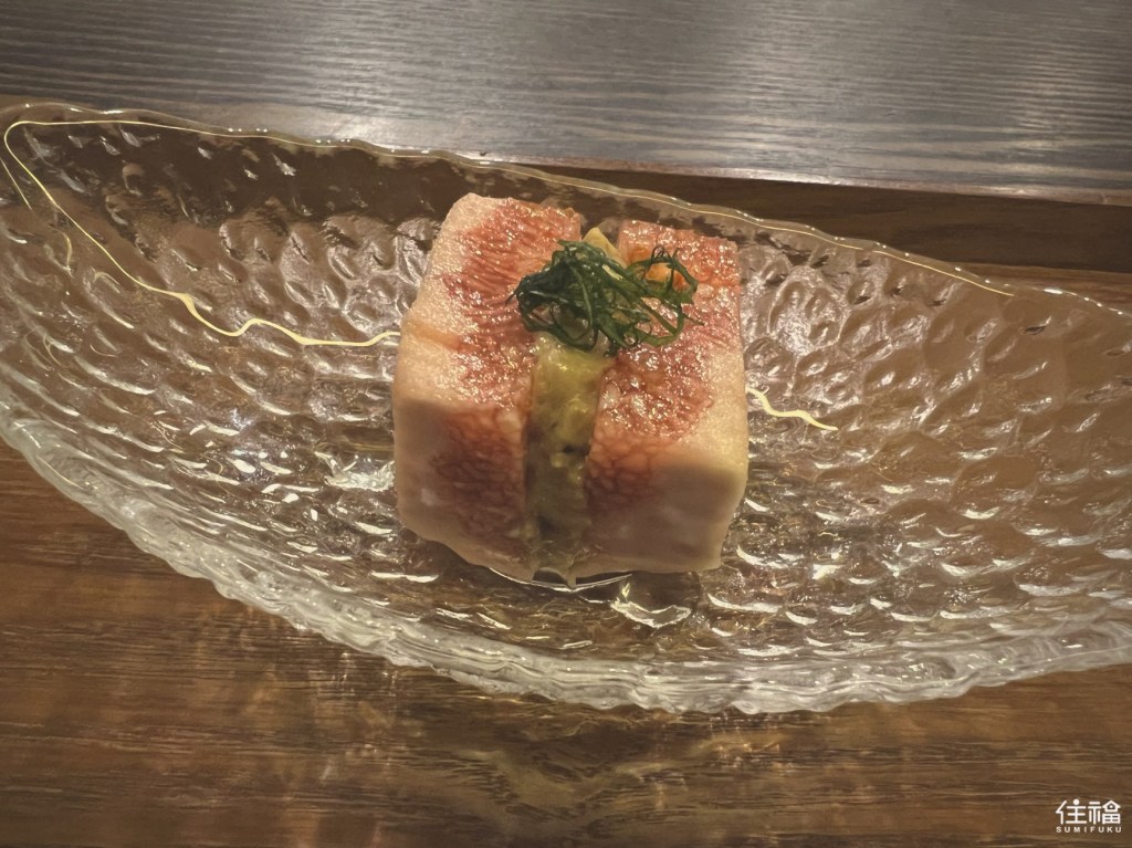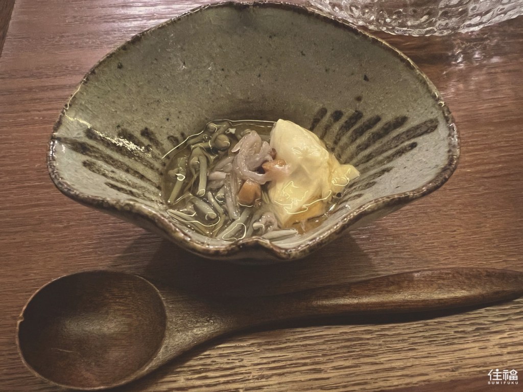 The second course was “Seasonal Brasenia and Vinegar with Broth (初物 じゅん菜と湯葉の酢の物)”. Brasenia is a summer water lily plant that has a rather refreshing taste and interesting texture to it.