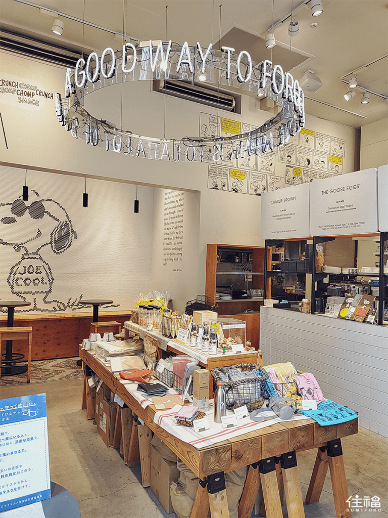 Next to the dining area, you will find the gift shop which is packed with exclusive PEANUTS Cafe merchandise. Here you can buy the Snoopy themed tableware used in the restaurant itself as well as other small goods such as posters, mugs, and snacks. The cool thing about this specific gift shop is that it has Snoopy goods from different eras. For example, you can get merchandise of the 1950s version of Snoopy, when he used to be drawn walking on four legs.