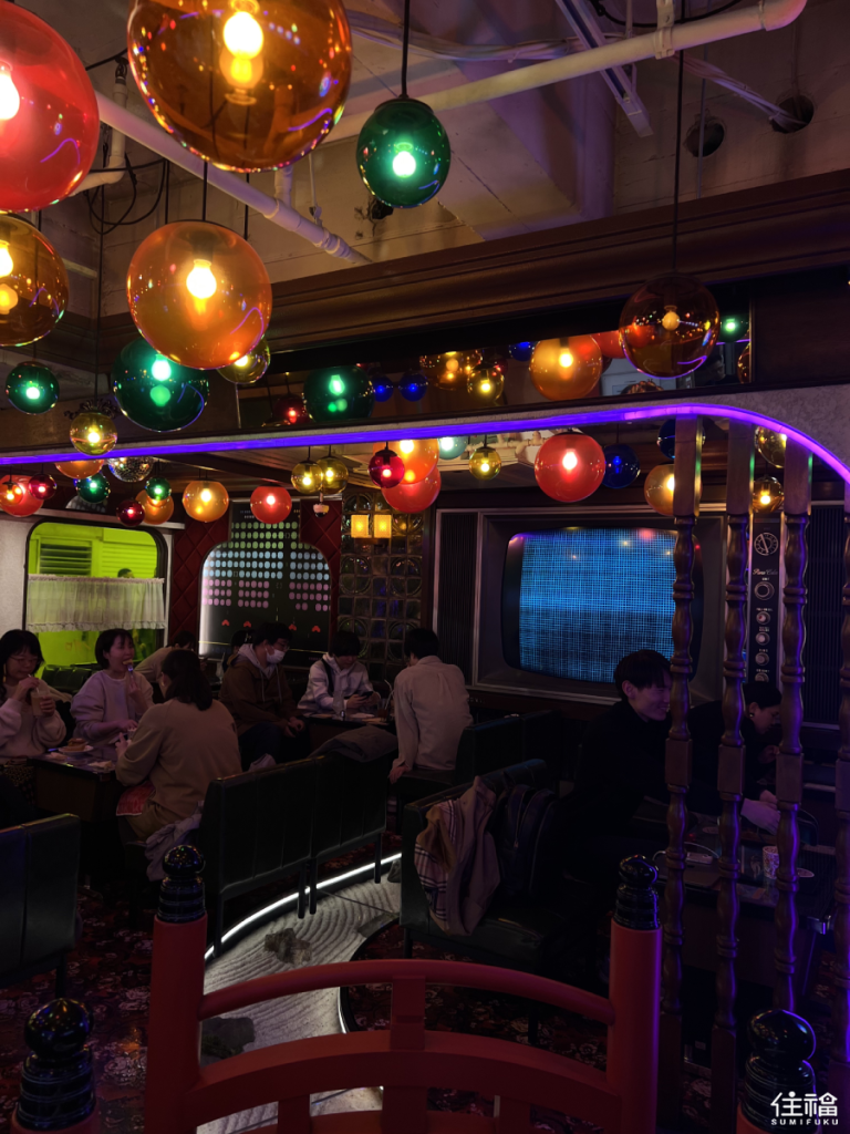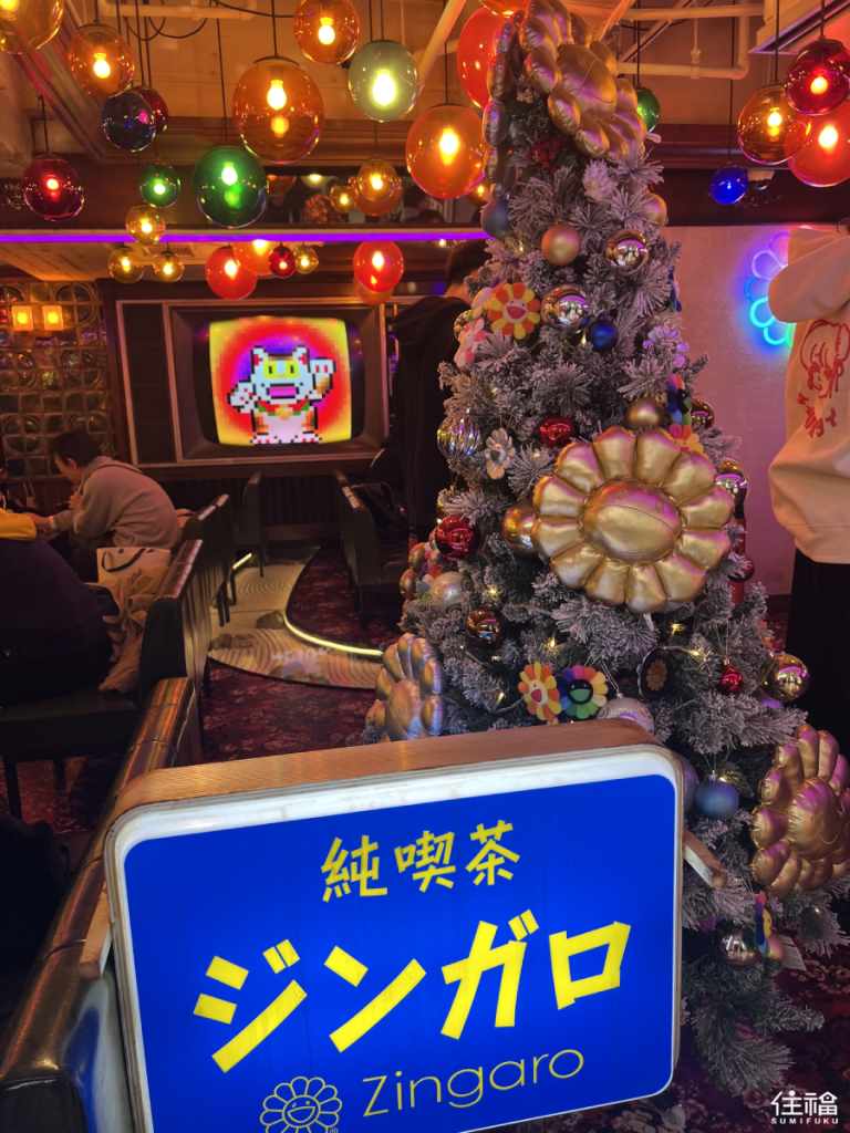 As soon as you step foot into this cafe, it feels as though you have simultaneously stepped back in time but into the future as well. The dark Showa-style furniture contrasts with Murakami’s contemporary and colorful artwork. You can see his famous flowers plastered everywhere as well as NFT videos playing on the retro TV. The tables even have games installed inside them, which can be played for an additional fee. The space perfectly appeals to any pop culture enthusiast and those looking for their next instagram snap.