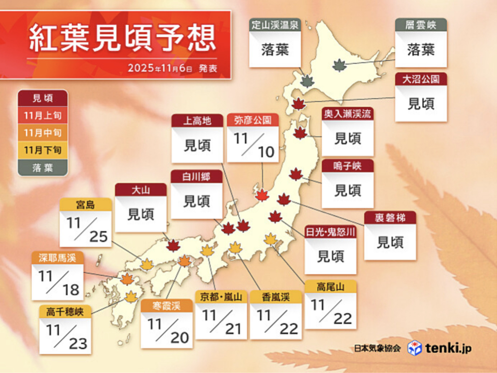 更新一張最新氣象發布的紅葉前線,看看哪些地方已經能看到美美的紅葉了!