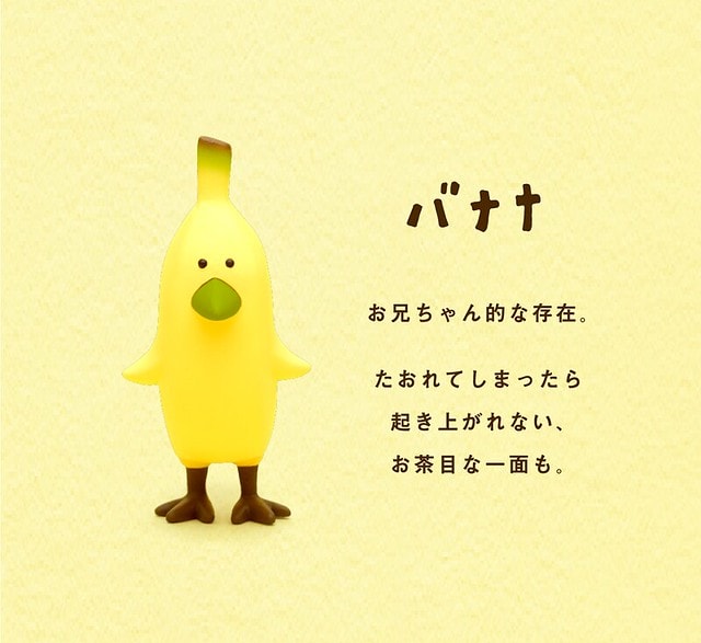 有著彎彎的身體的香蕉鳥,它的名子也是外來語「バナナ」。跟大家講一個香蕉不為人知的秘密,香蕉其實是一種莓類,不用懷疑,香蕉是莓果,而草莓不是莓果,因為以植物學的角度來看,香蕉的子是一起生長在水果內部,而草莓的子則是生長在水果外部,所以香蕉是莓類,草莓只是名子裡有「莓」字,但不屬於漿果類。