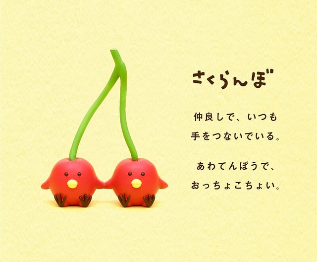 可愛的雙胞胎櫻桃鳥,它們的名子正是櫻桃「さくらんぼ」。大家應該都知道櫻桃小丸子,但是她的日文名子其實跟櫻桃沒有關係,只是剛好她姓「桜」名「桃子」,連在一起就變成「桜桃子」(さくらももこ),而她的綽號是「丸子」(まるこ),全部合在一起就變成「桜桃小丸子」。