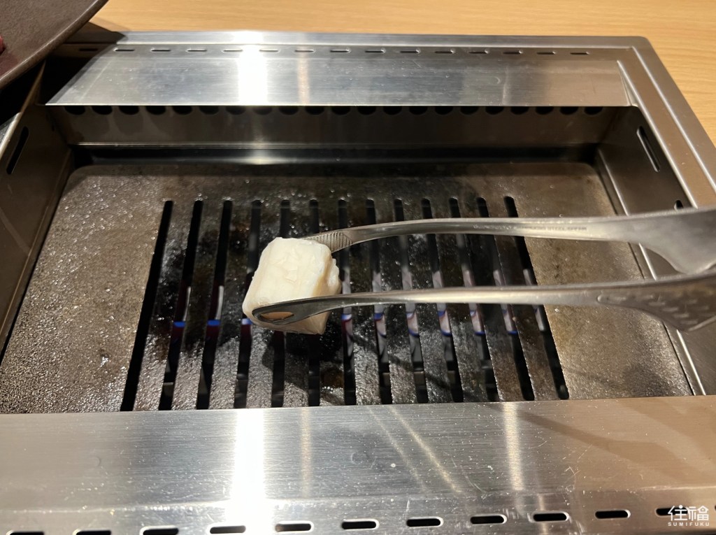 It was now time for the main event, the grilled Misaki beef. First, we needed to gently brush the grill with a layer of beef oil and then carefully place the beef tongue on top.